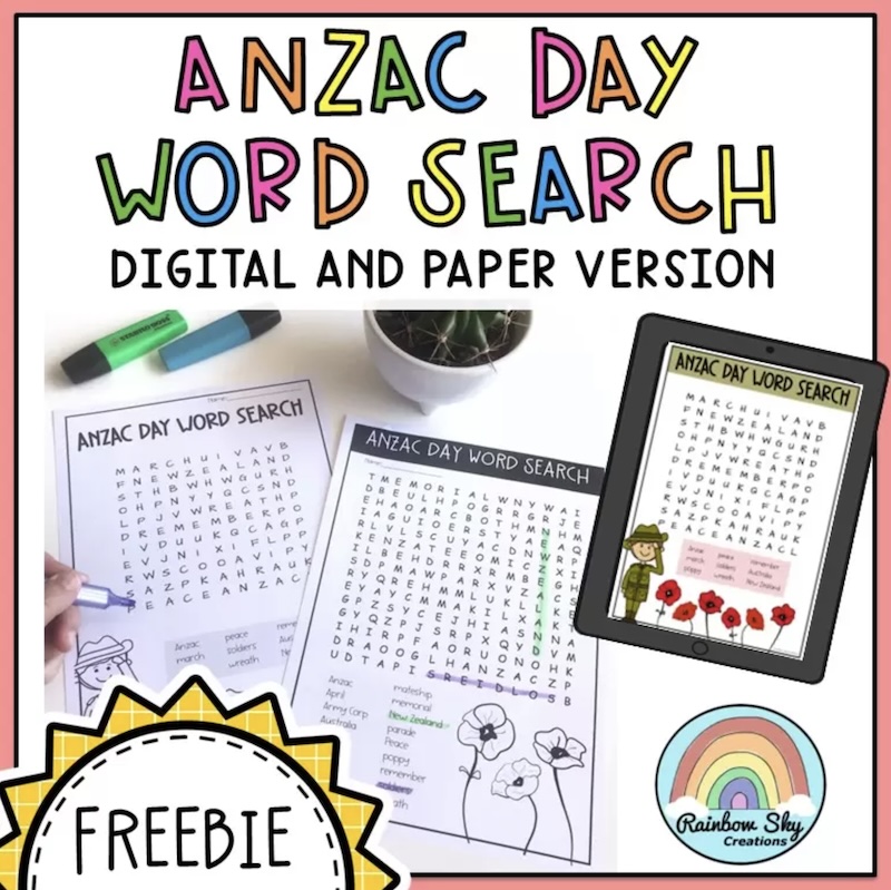 An easier one with 9 words (forwards and diagonal) and another including 17 words (forwards, backwards, diagonal) containing to ANZAC Day vocabulary.