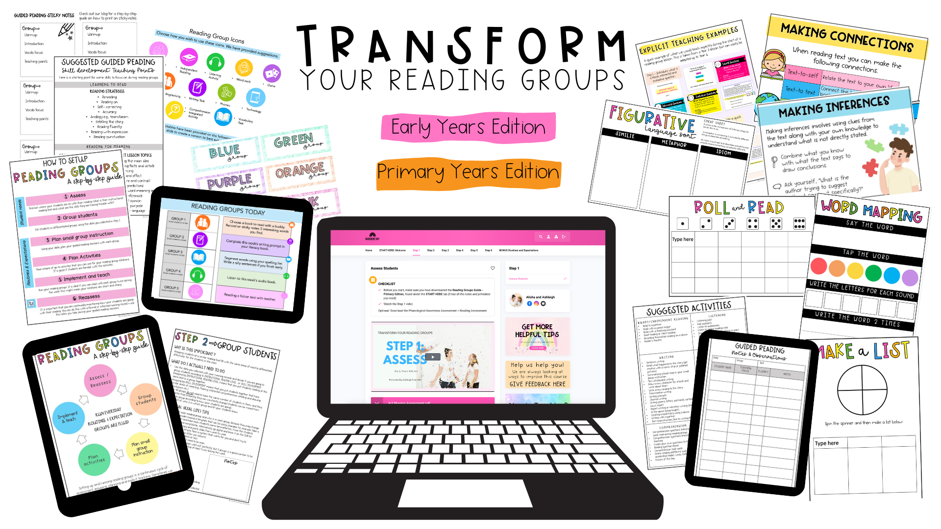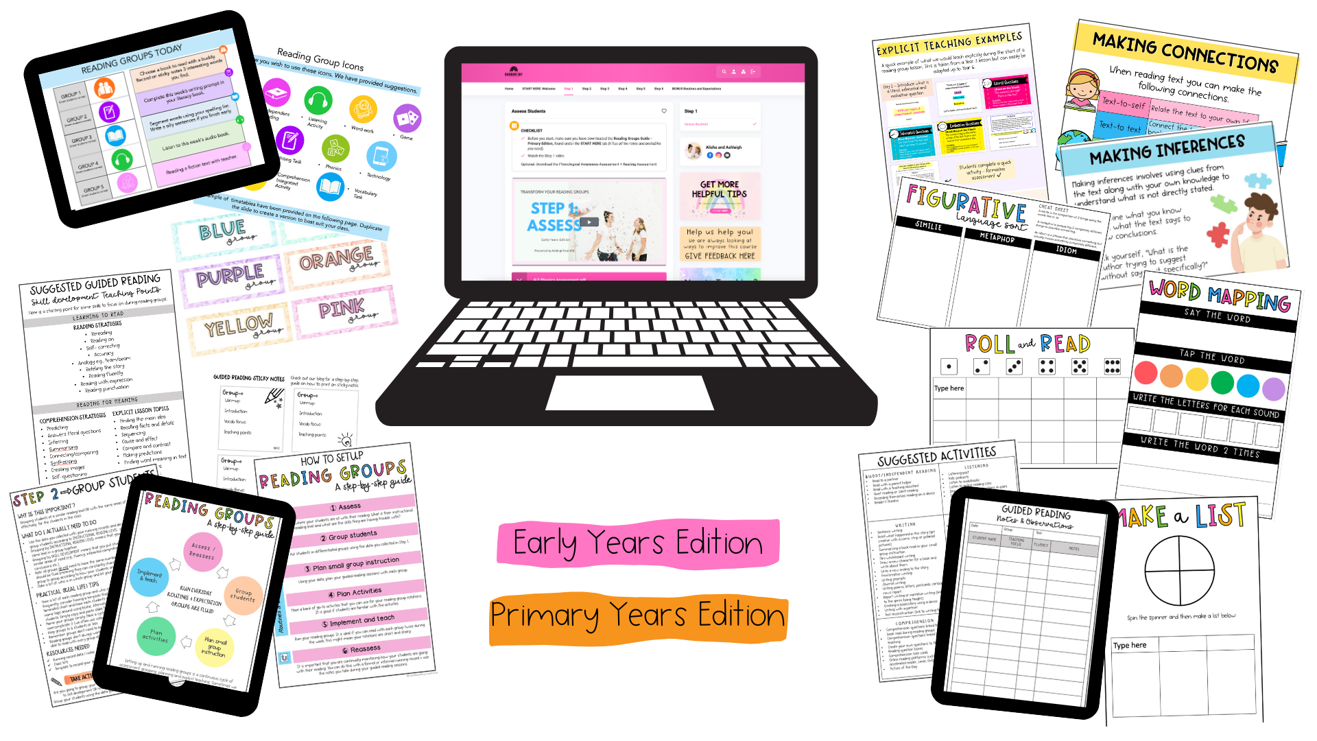 Reading assessments, note recording templates, group timetable + posters.